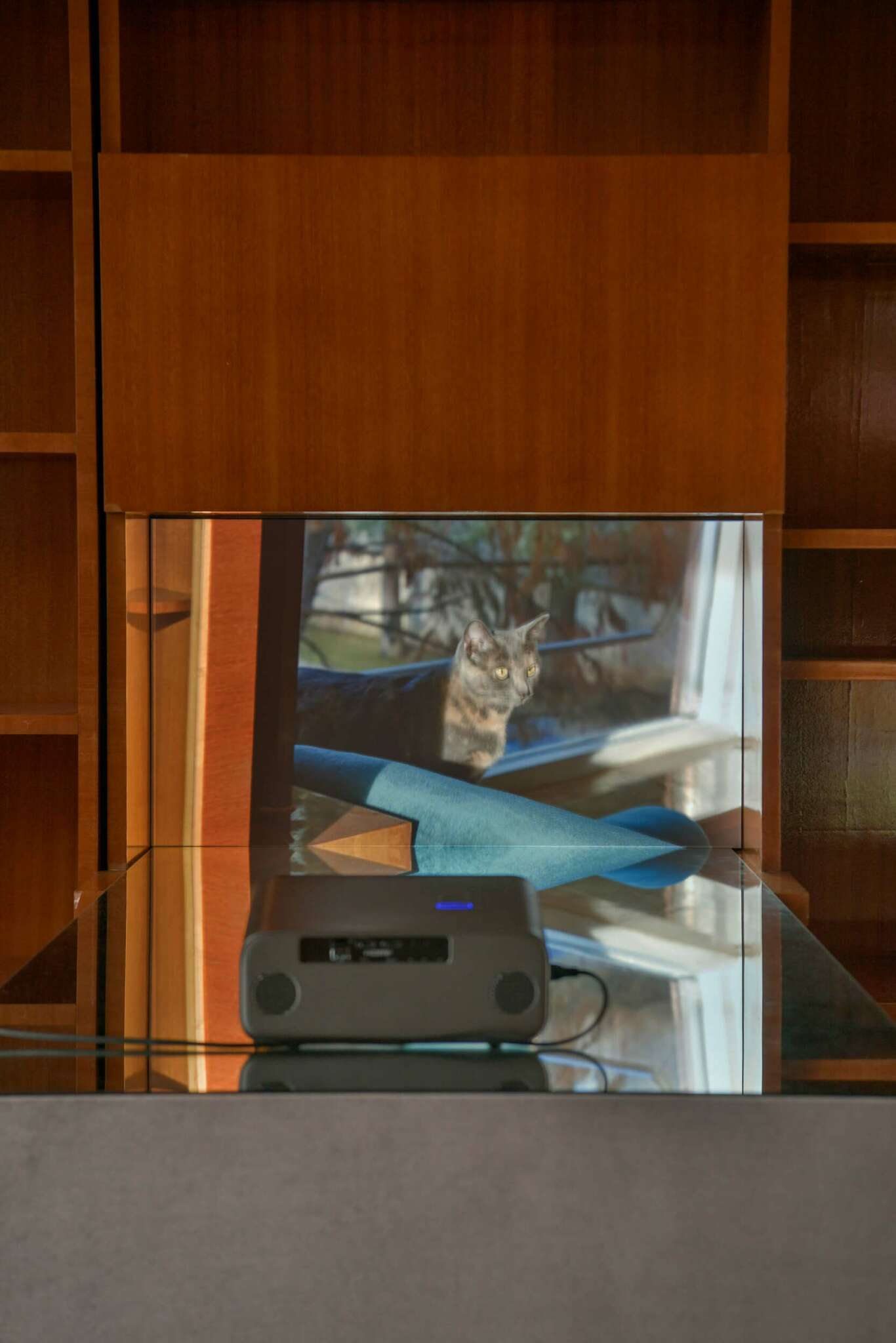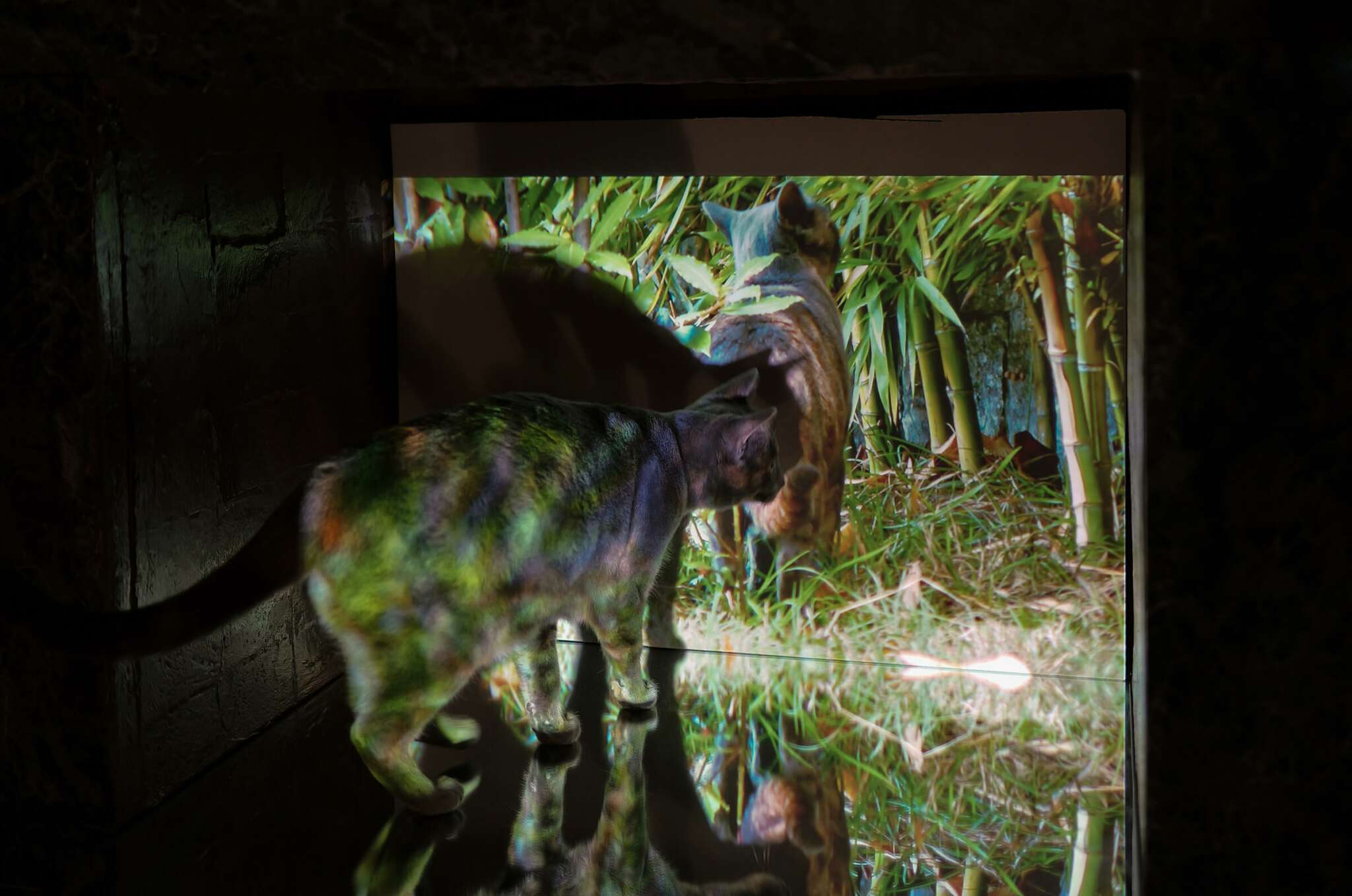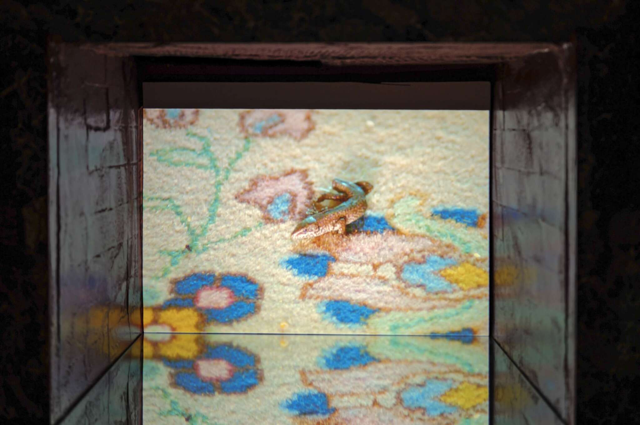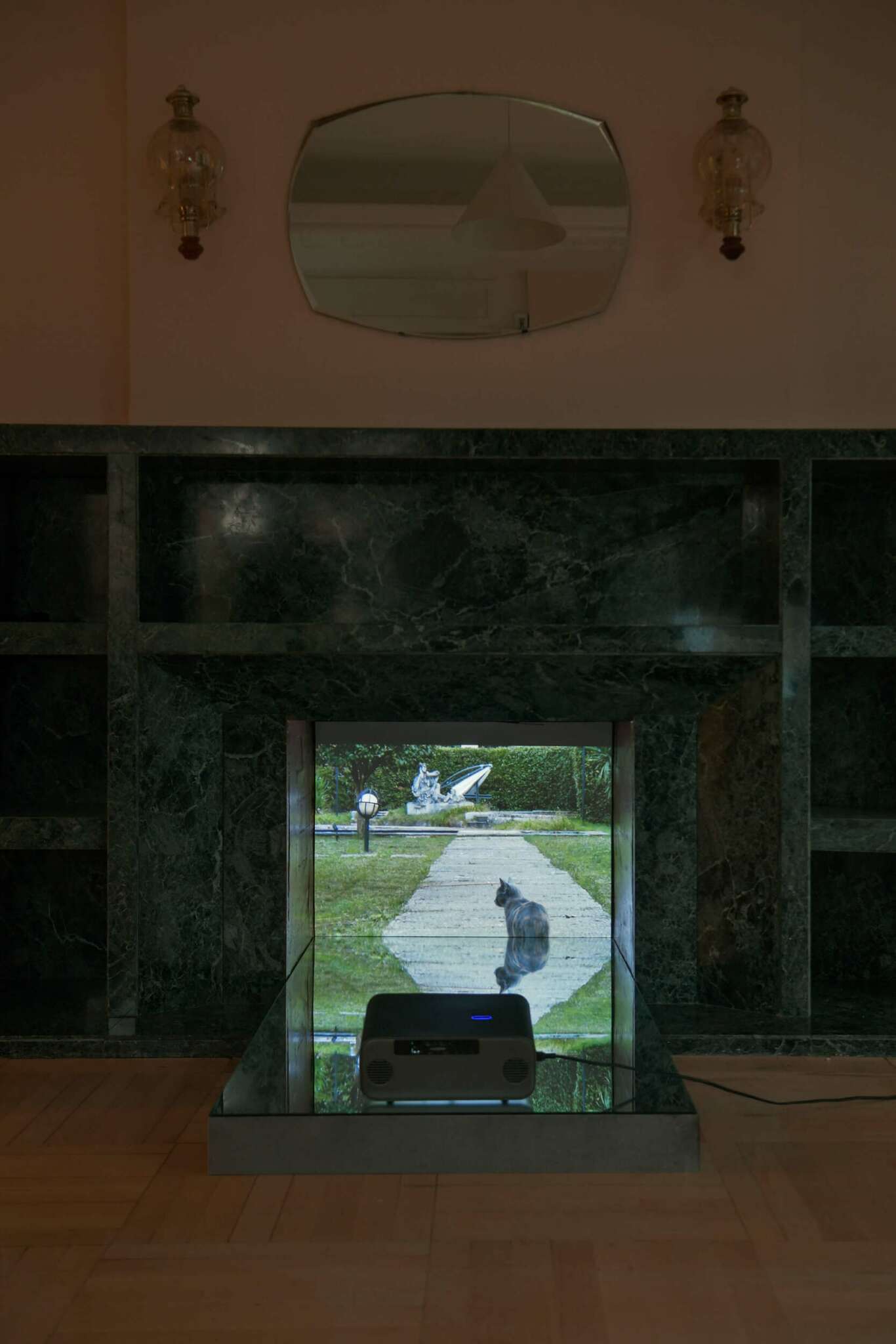As a two-channel video installation, the work is projected in site-specific architectural interventions within the room. Beneath the projections, mirror panels reflect these scenes back to us, implicating our own presence in this house and what it means for us to be here.