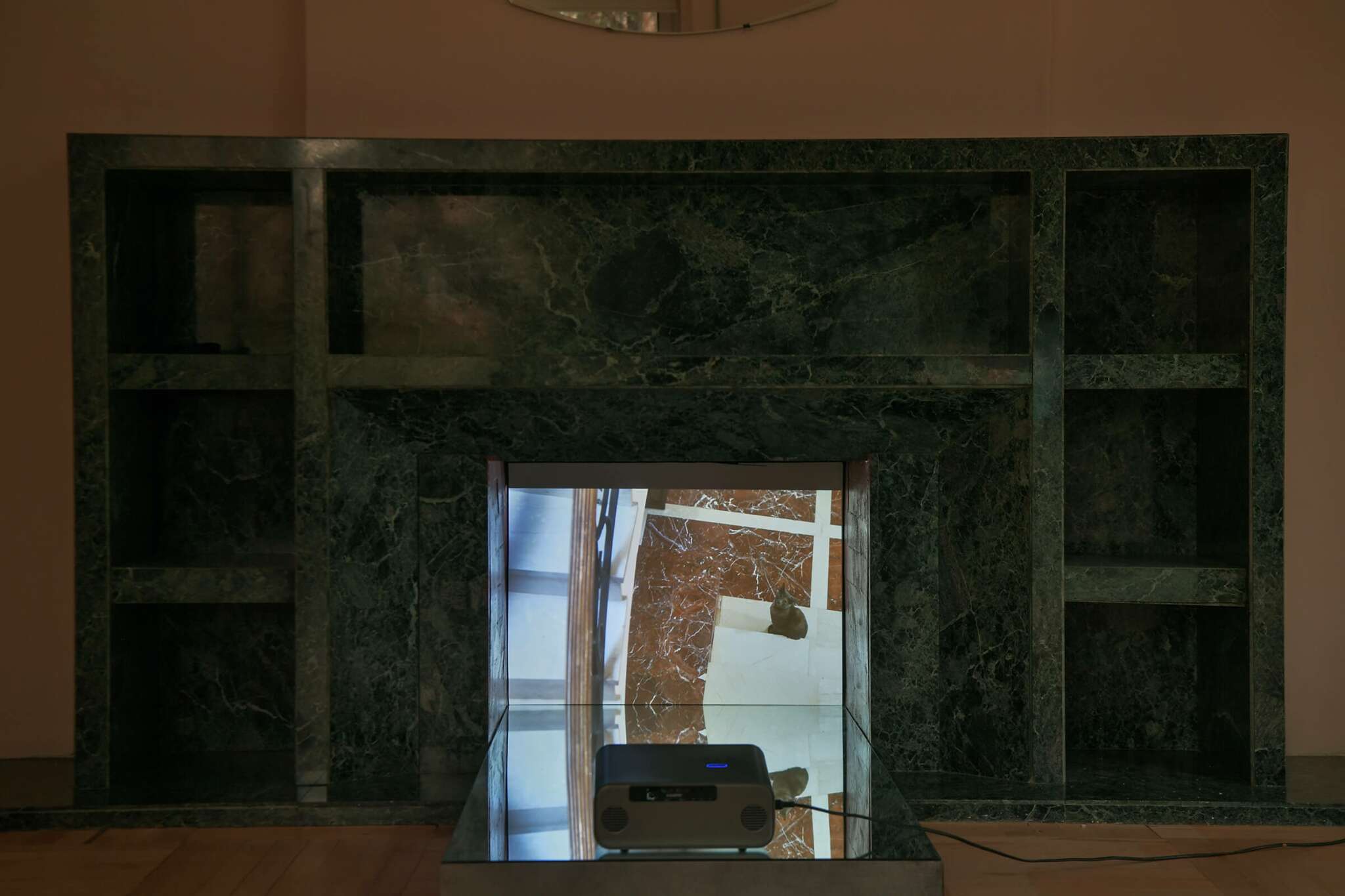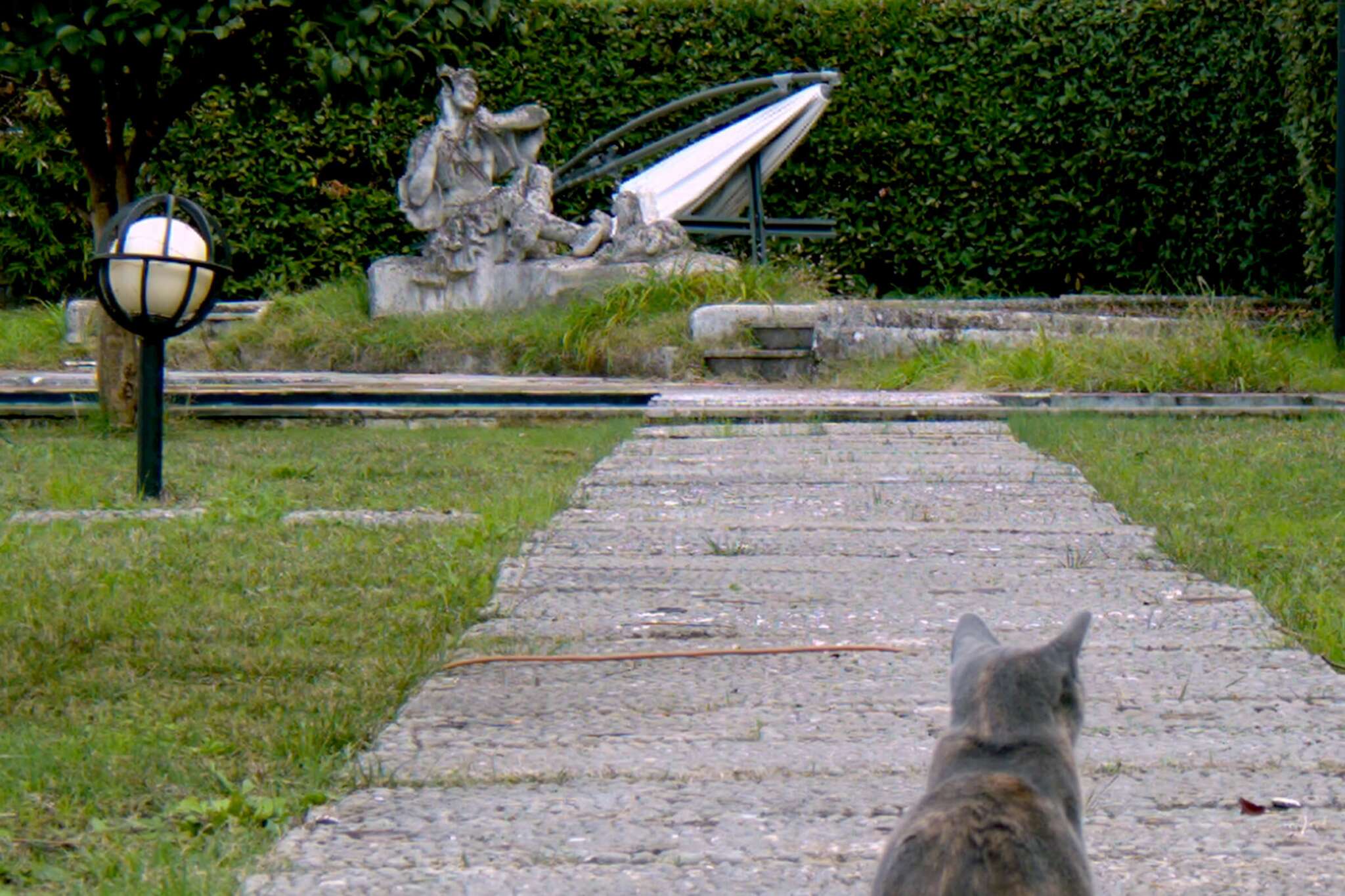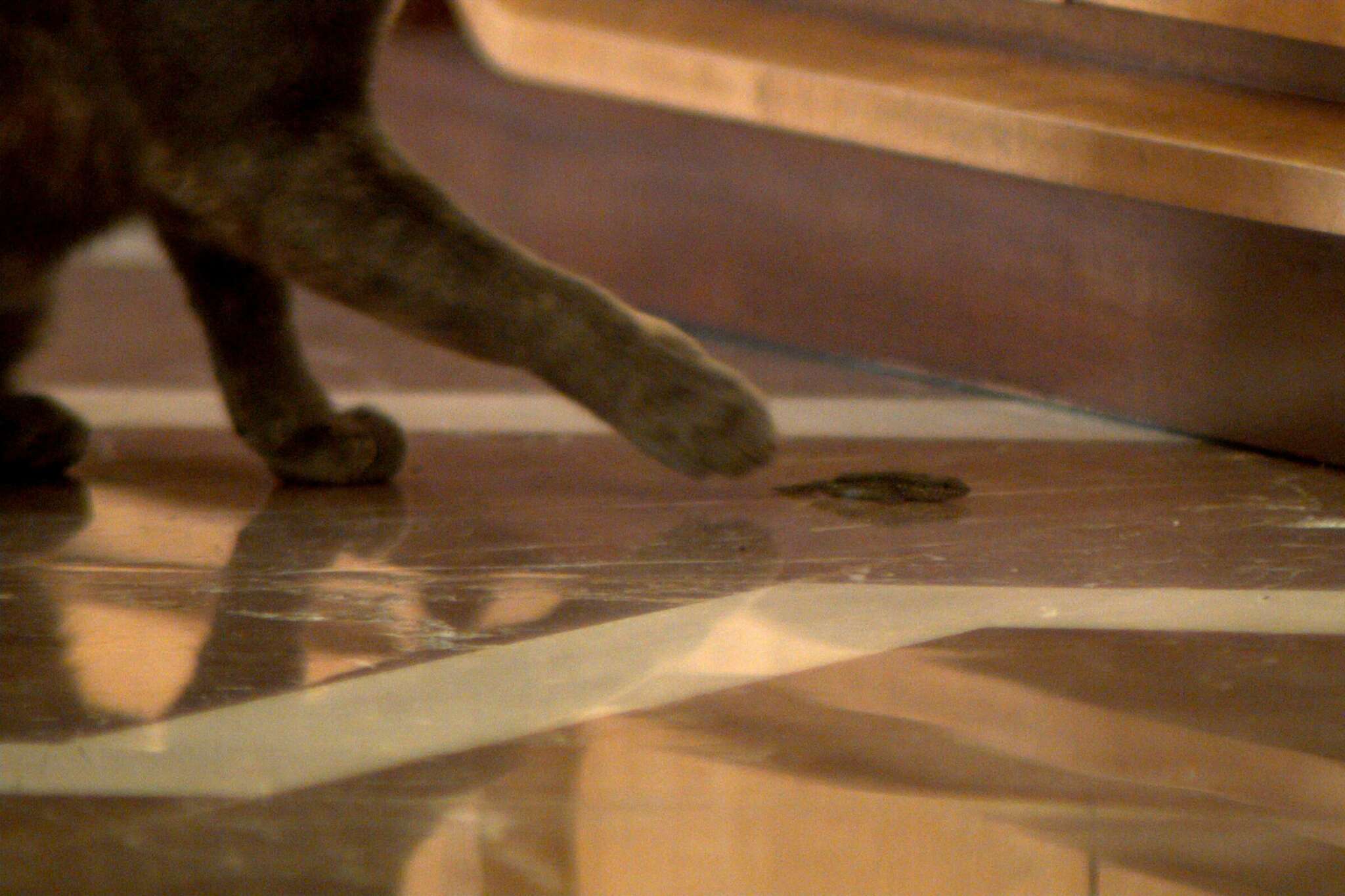 Oursa is a cat residing in an artist residency and cultural center that was the former home of Albanian dictator Enver Hoxha. Here, the camera lens follows Oursa’s daily activities: observing, lurking, sleeping, and toying with smaller prey, bringing lizards into the vast hallways of the building and often leaving them frozen and partially dismembered. These clips are intentionally not arranged as a narrative, but rather as a sequential, loosely categorized index.